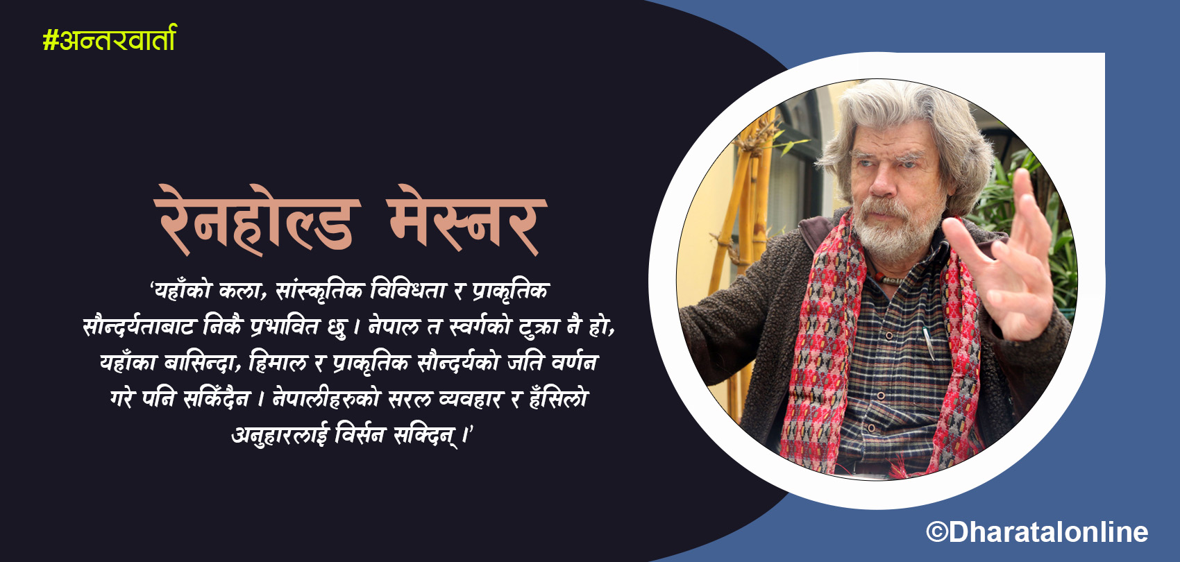 सन् १९४४ मा इटालीमा जन्मिएका विश्वप्रसिद्ध पर्वतारोही, अन्वेषक र यात्रा लेखक रेनहोल्ड मेस्नर यतिबेला नेपाल भ्रमणमा छन् ।